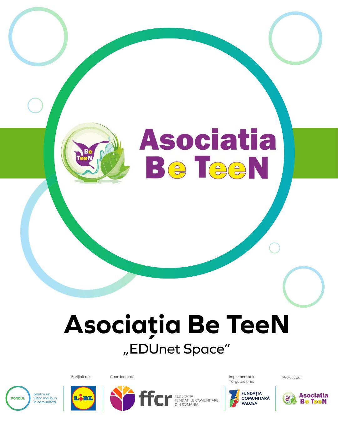 Proiectul EDUnet SPACE, implementat de Asociația Be Teen este finanțat prin Fondul pentru un viitor mai bun în comunități ediția 6, un program național de susținere a inițiativelor comunitare pentru educație, dezvoltat de @Federaţia Fundaţiile Comunitare din România – FFCR cu sprijinul @Lidl Romania și coordonat în Târgu Jiu de @Fundația Comunitară Vâlcea.